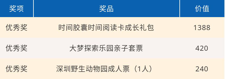 優(yōu)秀獎獲得者可贏得“時間膠囊時間閱讀卡成長禮包”“大夢探索樂園親子套票”“深圳野生動物園成人票(1人)”等禮品。其中,時間膠囊博物館作為此次活動的戰(zhàn)略合作單位和特別支持單位全程參與、深度支持,與大夢探索樂園共同成為官方指定體驗中心。