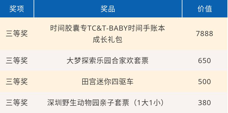 獲得三等獎的選手則可以獲得“時間膠囊專TC&T-BABY時間手賬本成長禮包”“大夢探索樂園合家歡套票”“田宮迷你四驅(qū)車”及“深圳野生動物園親子套票(1大1?。钡蓉S厚獎品。