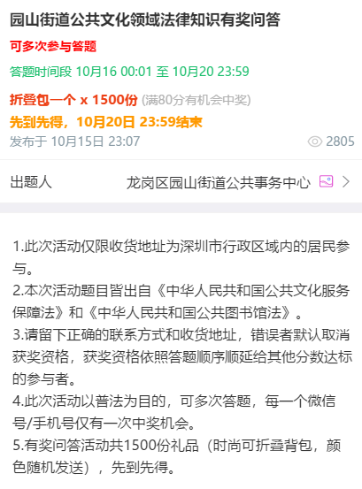 見圳客戶端·深圳新聞網(wǎng)2020年10月27日訊 (記者 田志強(qiáng) 通訊員 許可)為加強(qiáng)園山街道公共文化服務(wù)體系建設(shè),宣傳普及 《中華人民共和國公共文化服務(wù)保障法》和《中華人民共和國公共圖書館法》 (以下簡稱“兩法”),進(jìn)一步豐富人民群眾精神文化生活,更好地保障人民群眾的基本文化權(quán)益,推動(dòng)園山街道公共文化服務(wù)高質(zhì)量發(fā)展,促進(jìn)轄區(qū)文化繁榮發(fā)展,近日,園山街道組織開展了“兩法”文化線上普法宣傳系列活動(dòng)。此次活動(dòng)通過轄區(qū)內(nèi)各園區(qū)及各社區(qū)居民小組微信群廣泛宣傳,覆蓋近萬名轄區(qū)居民。