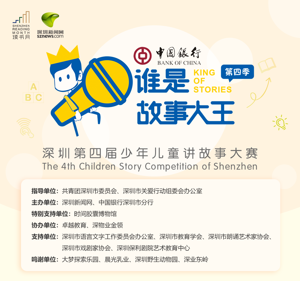 “誰(shuí)是故事大王·第四季”活動(dòng)由共青團(tuán)深圳市委員會(huì)、深圳市關(guān)愛(ài)行動(dòng)組委會(huì)辦公室指導(dǎo),深圳新聞網(wǎng)、中國(guó)銀行深圳市分行聯(lián)合主辦,卓越教育、深物業(yè)金領(lǐng)協(xié)辦,活動(dòng)還得到了時(shí)間膠囊博物館、大夢(mèng)探索樂(lè)園的特別支持。