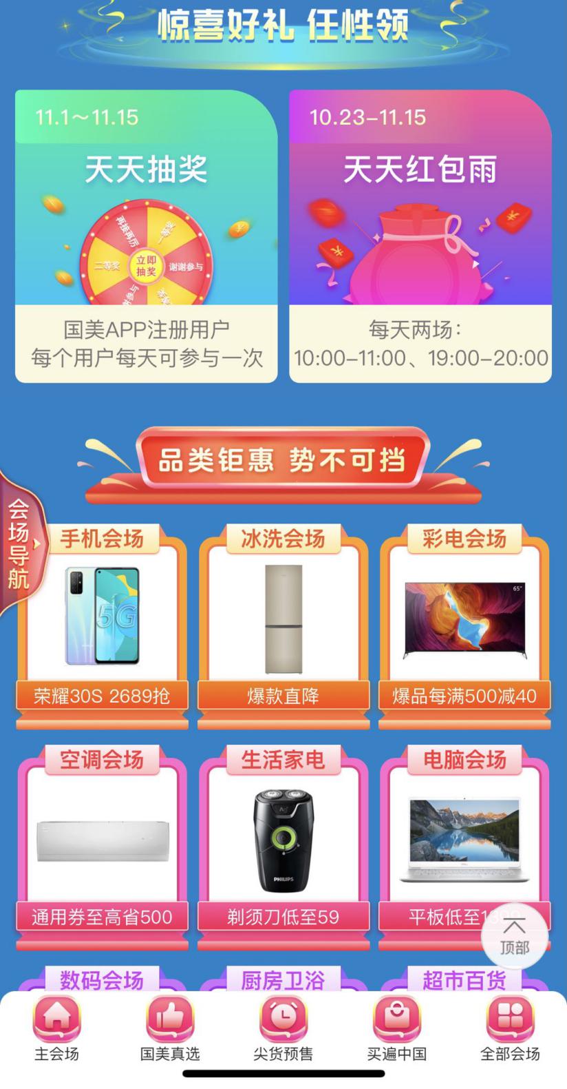 見圳客戶端·深圳新聞網(wǎng)2020年10月29日訊 轉(zhuǎn)眼已經(jīng)到了十月末,11.11狂歡浪潮已然襲來!從本周開始,各大平臺(tái)已經(jīng)開啟購物狂歡。本次國美“11.11”大促活動(dòng)時(shí)間由10月23日開始,一直持續(xù)到11月15日,整個(gè)狂歡節(jié)全程囊括了“國美真選”、“九九會(huì)員”、“買遍中國超級(jí)直播”、“飛天茅臺(tái)酒”等眾多板塊活動(dòng)內(nèi)容。另外,還有每日簽到、抽獎(jiǎng)、紅包雨、拼購等互動(dòng)搶福利玩法,一大波好物好玩等你圍觀,絕對滿足你薅羊毛、低價(jià)搶好物的期待。今年如何玩轉(zhuǎn)11.11?給您安排上!
