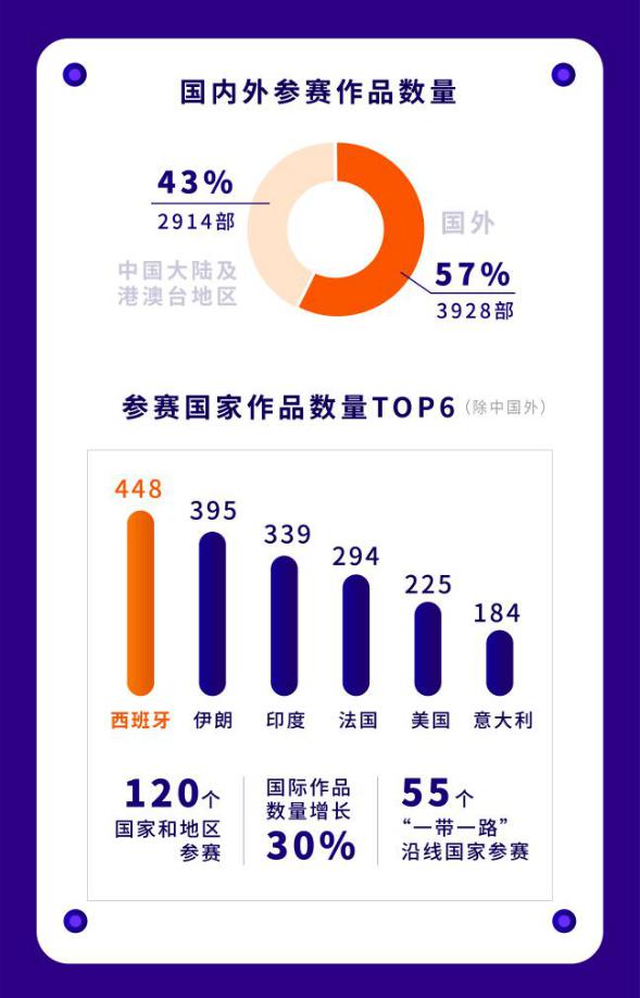 自今年9月中旬全球短片征集啟動以來,本屆短片節(jié)獲得來自世界各地創(chuàng)作者的積極響應,盡管受到新冠疫情影響以及遭遇影視產(chǎn)業(yè)寒冬,但本屆短片節(jié)參賽作品數(shù)量卻逆勢而上,并刷新歷史新高。而且,在今年的6842部參賽作品中,國際參賽作品多達3928部,數(shù)量較去年增長30%,占作品總量的57%。在今年參賽的120個國家和地區(qū)中,作品數(shù)量位居前六名的國家分別是西班牙(448部)、伊朗(395部)、印度(339部)、法國(294部)、美國(225部)和意大利(184部)。值得一提的是,作為深圳市參與“一帶一路”建設重點項目,短片節(jié)今年吸引了來自“一帶一路”沿線的55個國家參賽,約占目前65個“一帶一路”沿線國家數(shù)的85%,短片節(jié)作為推動“一帶一路”沿線國家間人文交流、促進全球跨文化傳播的重要平臺的作用日益凸顯,國際化進一步走向深入。