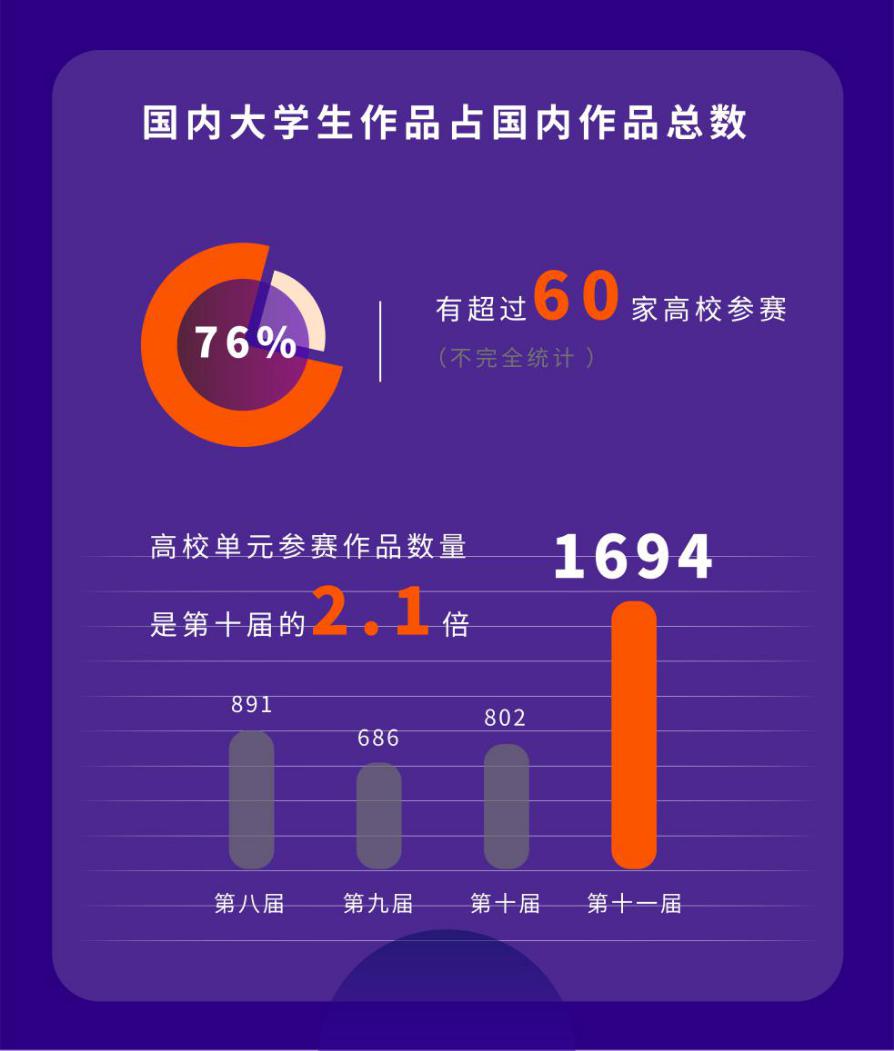 作為參與金鵬短片導演扶持計劃的重要力量,今年高校大學生的參賽積極性持續(xù)高漲。本屆短片節(jié)發(fā)起的“全國大學生視頻創(chuàng)意大賽”共收到來自全國超過60所高校的1694部參賽作品,數(shù)量同比增長一倍。國內(nèi)大學生參賽作品數(shù)量在所有國內(nèi)參賽作品總數(shù)中占比58%,大學生創(chuàng)作者一躍成為金鵬短片導演扶持計劃的中堅力量,凸顯了新時代下年輕創(chuàng)作者對短片以及短視頻的無限熱情和興趣執(zhí)著。大學生競賽單元將分別評選出“最佳大學生短片”、“最佳大學生劇情短片”、“最佳大學生紀錄短片”、“最佳大學生動畫短片”、“最佳大學生VLOG短片”、“最佳大學生科普短片”、“最佳大學生廣告創(chuàng)意短片”、“最佳大學生原創(chuàng)音樂短片”等9大類型入圍優(yōu)秀作品。