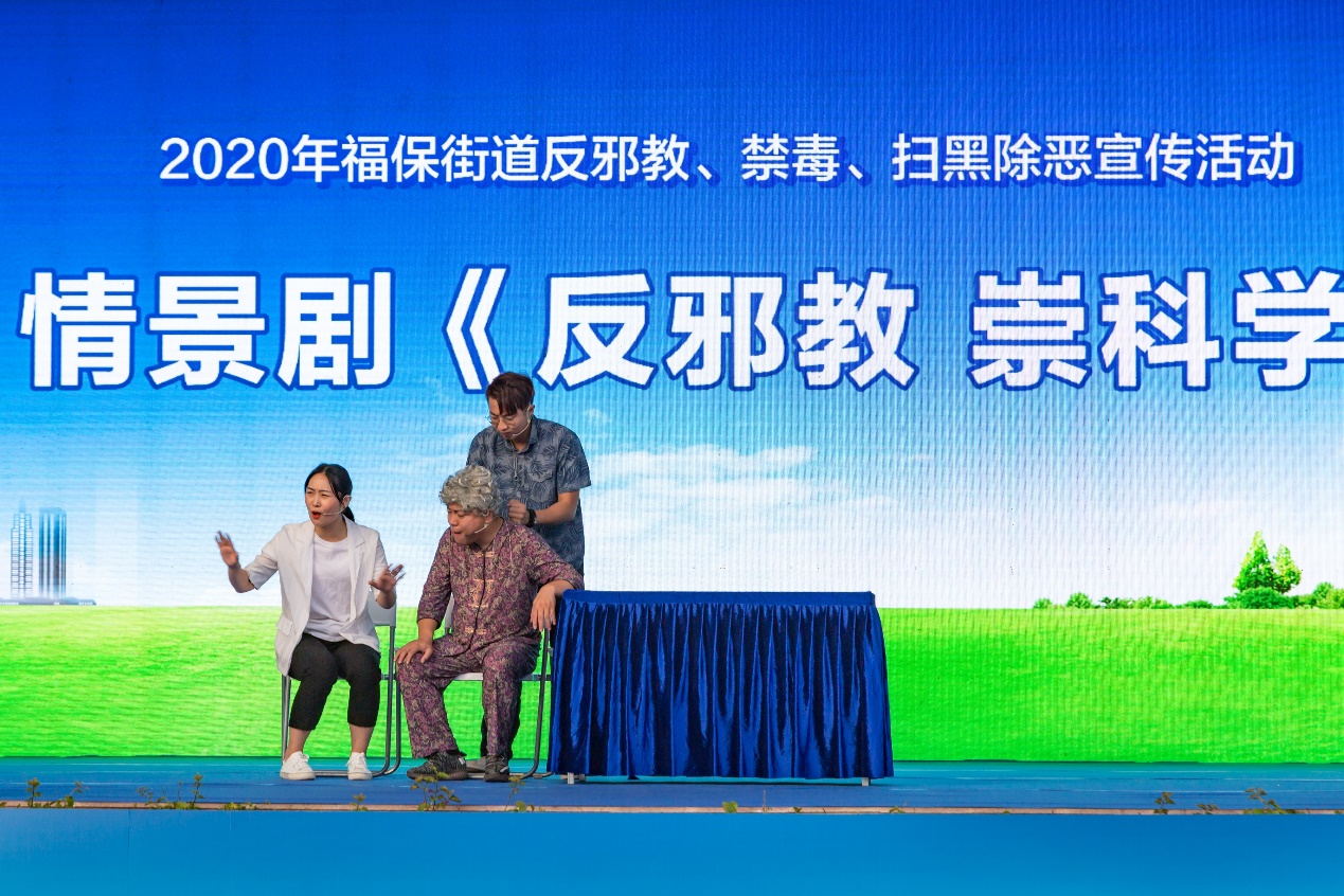 宣傳活動(dòng)以“拒絕邪教共建平安”為主題,打造一場(chǎng)群眾喜聞樂(lè)見(jiàn)的文藝演出?;顒?dòng)在一曲健康、活力的《康康舞》中拉開(kāi)帷幕,整場(chǎng)演出主題鮮明、內(nèi)容豐富、精彩紛呈。央視《星光大道》優(yōu)秀歌手演唱一曲禁毒主題歌曲《遠(yuǎn)離毒品》,配合禁毒舞蹈《不放棄、不拋棄》向現(xiàn)場(chǎng)居民群眾宣傳什么是毒品、毒品的危害及防毒拒毒的基本知識(shí);情景劇《黑勢(shì)力的下場(chǎng)》用通俗易懂的形式,普及了什么是黑惡勢(shì)力、黑惡勢(shì)力的社會(huì)危害性和法律后果;小品《邪教害人》、對(duì)口相聲《說(shuō)學(xué)逗唱話科學(xué)》、情景劇《反邪教崇科學(xué)》接連上演,以生動(dòng)的表演引導(dǎo)廣大居民群眾崇尚科學(xué)、反對(duì)邪教。