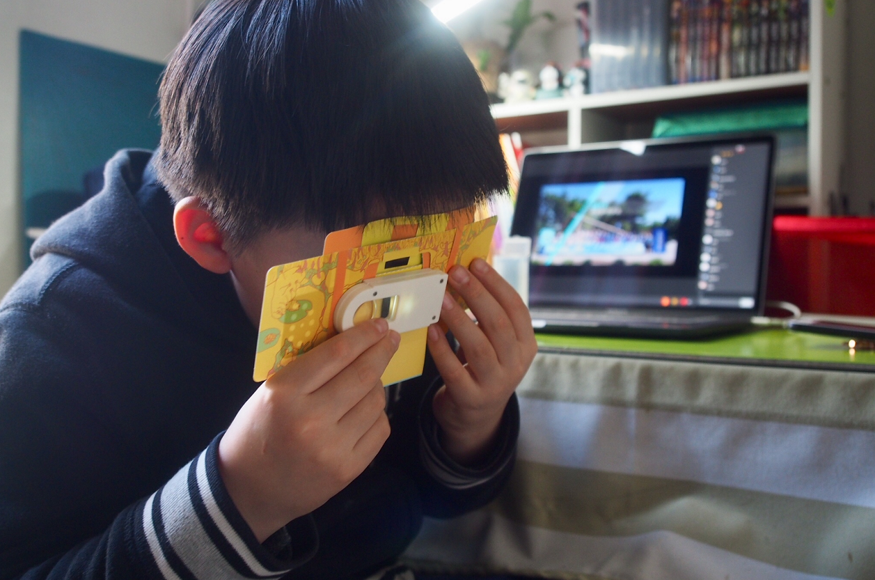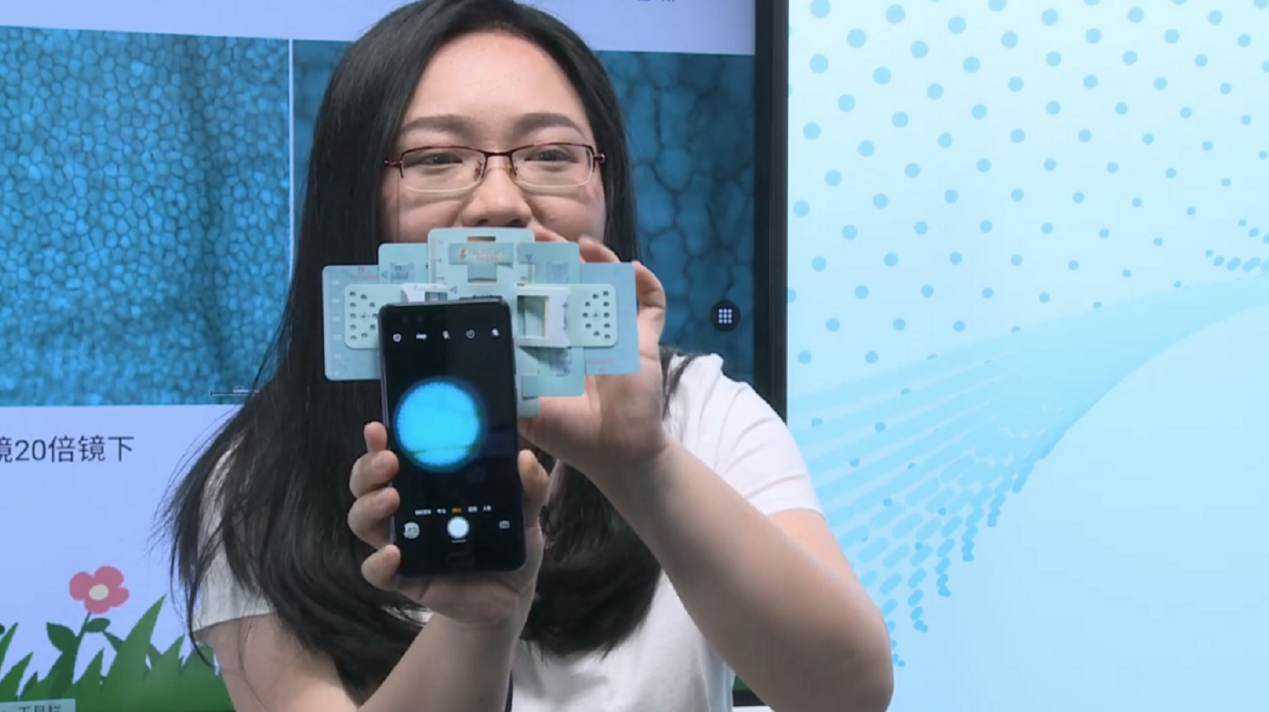 《探索·微觀世界》直播課老師通過(guò)卡片顯微鏡道具觀看標(biāo)本