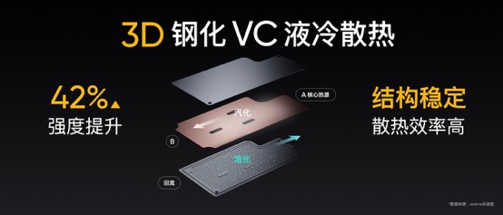 真我GT的性能表現,離不開優(yōu)秀散熱技術的強力支持,創(chuàng)新的3D鋼化液冷散熱不乏好評。作為GT系列戰(zhàn)略成員,真我GT Neo繼承了GT系列的強悍基因,同樣搭載3D鋼化VC液冷散熱。創(chuàng)新的3D鋼化VC液冷散熱不僅大幅度提高了均熱板的強度,同時內部的結構優(yōu)化也讓整體的散熱效率進一步提升。配合100%覆蓋核心發(fā)熱源的多重立體散熱系統(tǒng),高性能的同時保持冷靜。