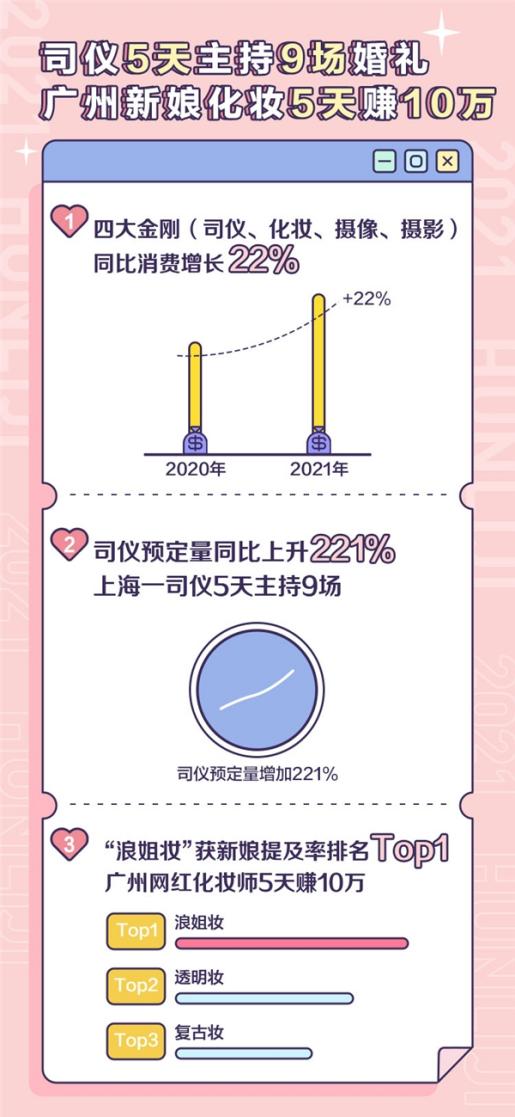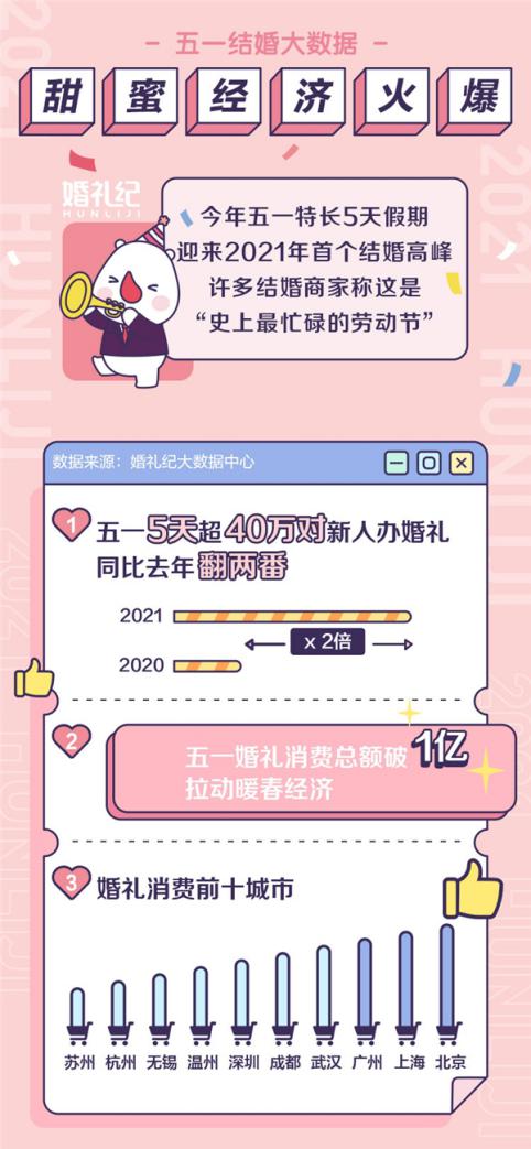 數(shù)據(jù)顯示,五一迎來2021年首個(gè)結(jié)婚高峰,5天內(nèi)超40萬對新人舉辦婚禮,同比去年翻兩番。五一婚禮消費(fèi)總額破1億,在一定程度上拉動(dòng)暖春經(jīng)濟(jì)。婚禮消費(fèi)前十城市分別是北京、上海、廣州、武漢、成都、深圳、溫州、無錫、杭州、蘇州。