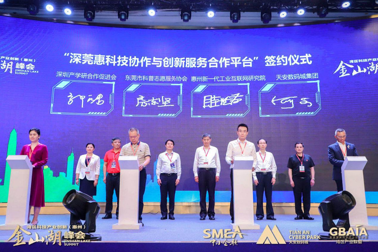 峰會當天,在廣東省科學技術協(xié)會黨組書記鄭慶順,惠州市委常委、市政府常務副市長何廣延,深圳市科學技術協(xié)會黨組書記林祥,東莞市科學技術協(xié)會一級調(diào)研員李小兵,惠州市科學技術協(xié)會黨組書記羅金星,惠州市科學技術協(xié)會主席費霞的見證下,深圳產(chǎn)學研合作促進會郭皓、東莞市科普志愿者協(xié)會房志堅、惠州新一代工業(yè)互聯(lián)網(wǎng)創(chuàng)新研究院眭世榮、惠州市天安數(shù)碼城有限公司何文共同上臺簽約,正式開啟深莞惠科技協(xié)作與創(chuàng)新服務新篇章。