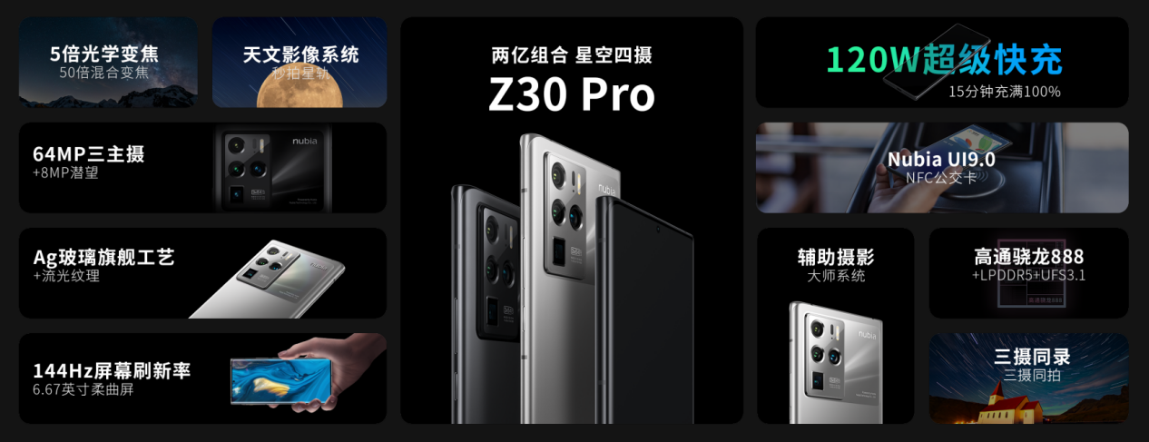 努比亞Z30 Pro將用戶需求與行業(yè)最前沿科技充分結(jié)合,打造無短板頂尖配置:搭載高通驍龍888+LPDDR5+UFS3.1頂尖性能鐵三角及行業(yè)最高的2億像素四攝組合全主攝影像系統(tǒng),獨(dú)占影像旗艦中最強(qiáng)的120W超級(jí)快充與144 Hz超高刷新率,并將全新升級(jí)的UI交互系統(tǒng)和更加強(qiáng)悍易用的影像功能融于一身,貫徹科技、藝術(shù)與用戶需求完美融合的平衡之道。全新一代努比亞Z系列旗艦——Z30 Pro攜星光而來。