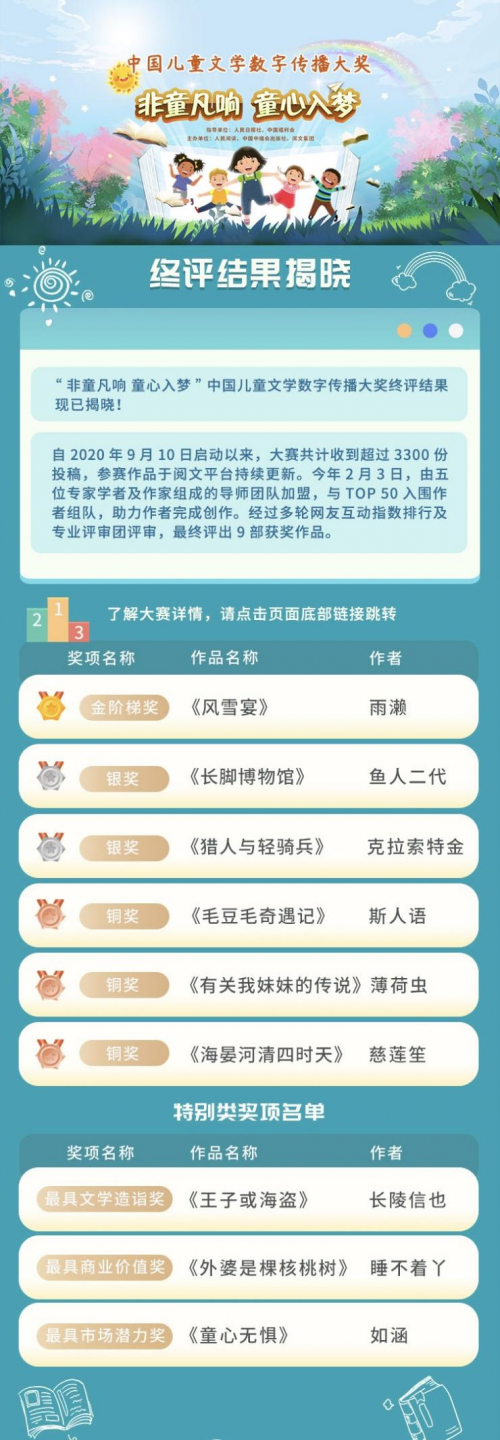 深圳新聞網(wǎng)2021年6月1日訊“非童凡響童心入夢”中國兒童文學(xué)數(shù)字傳播大獎6月1日揭曉終評結(jié)果,《風(fēng)雪宴》等9部參賽作品從3300余部作品中脫穎而出。大獎終評頁面已在人民日報數(shù)字傳播有限公司旗下“人民閱讀”平臺、中國中福會出版社、閱文集團等平臺全面上線。