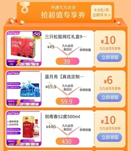 活動期間,九九會員可搶專享大額券,大牌網(wǎng)紅爆品狂歡底價。三只松鼠網(wǎng)紅堅果禮盒998g*2券后價39元,藍月亮洗衣液禮包券后價59.9元,劍南春52度500ml酒券后價430元......實實在在讓用戶買到“真低價”,買的“真值得”!