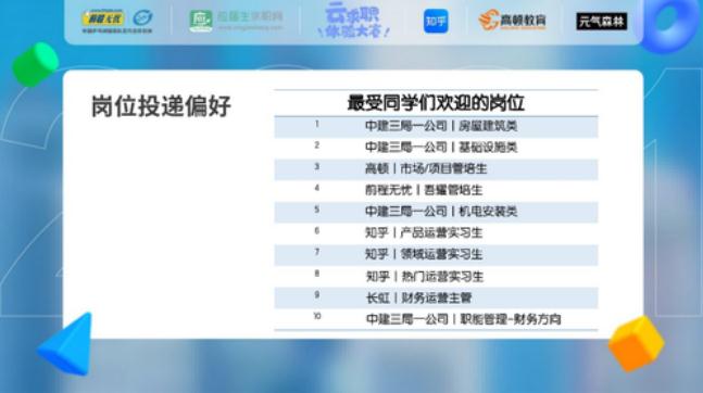 這一點在本次大賽中,也得到了很好的證明,10家企業(yè)提供的54個崗位中,投遞量最高的10個職位分別來自中建三局一公司、知乎,另外高頓及前程無憂的管培生分別排在第三、第四,不難發(fā)現(xiàn),國企、管培、互聯(lián)網(wǎng)對當代大學生來說,更具備吸引力~
