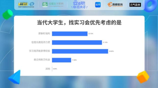 大家在尋找實習的過程中,會優(yōu)先考慮的三個因素分別是實習是否能獲得經(jīng)驗、住宿交通是否方便、薪酬和福利。