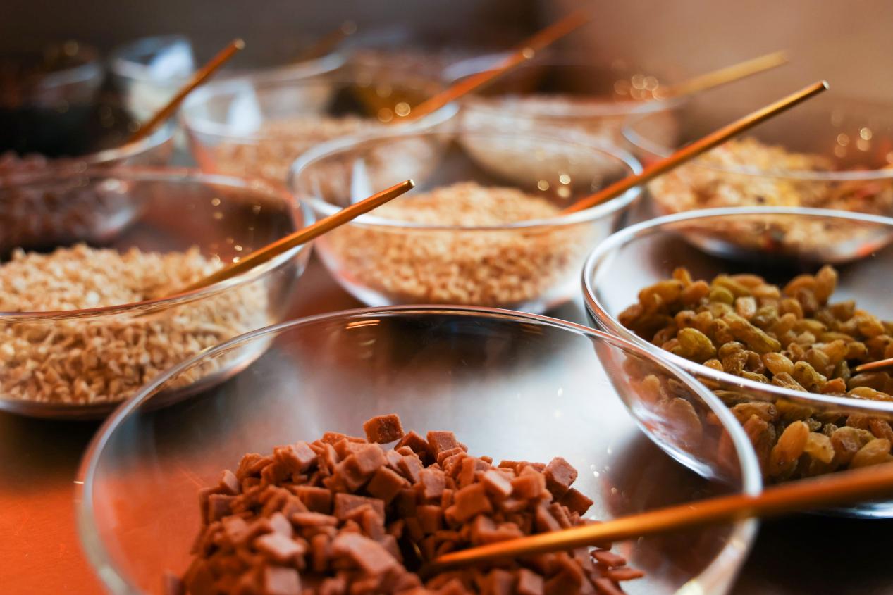 除了產(chǎn)品口味、形式上的革新,探魚的lab店還新增了“DIY”專區(qū)。茶水、水果、涼菜、冰粉都可以在DIY區(qū)根據(jù)自己的口味隨意搭配,增加了消費(fèi)者在用餐過程中的可玩性。值得一提的是,探魚的DIY冰粉取消了目前市場中常見的或固定或多樣的搭配方式,為消費(fèi)者提供了3種冰粉基底,18種各色配料,搭配方式和用量全部由消費(fèi)者自己選擇。不同口味質(zhì)地的配料為消費(fèi)者提供了至少17000+種配比方式,這樣的設(shè)置潛在性地增加了用餐的社交功能,在整個(gè)就餐過程中,消費(fèi)者被擁有了“體驗(yàn)者”與“傳播者”的功能性身份,擁有了一場“就餐+游戲”的個(gè)性體驗(yàn)。