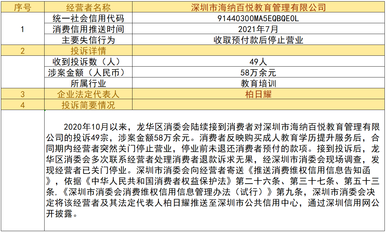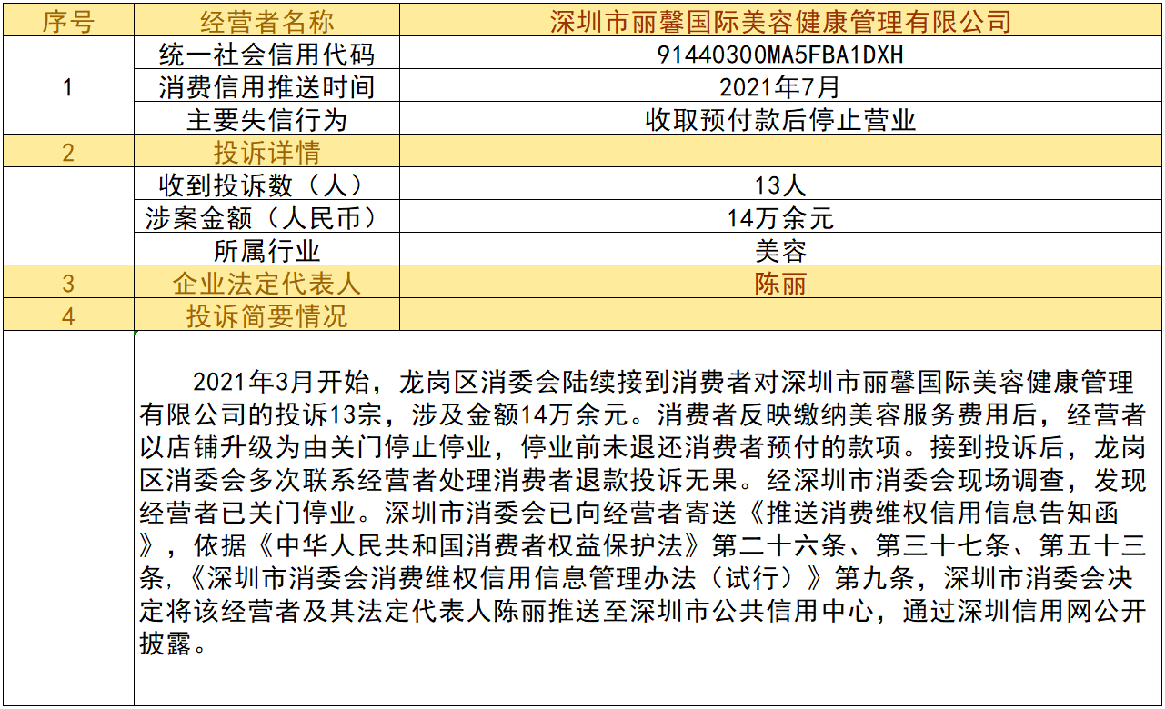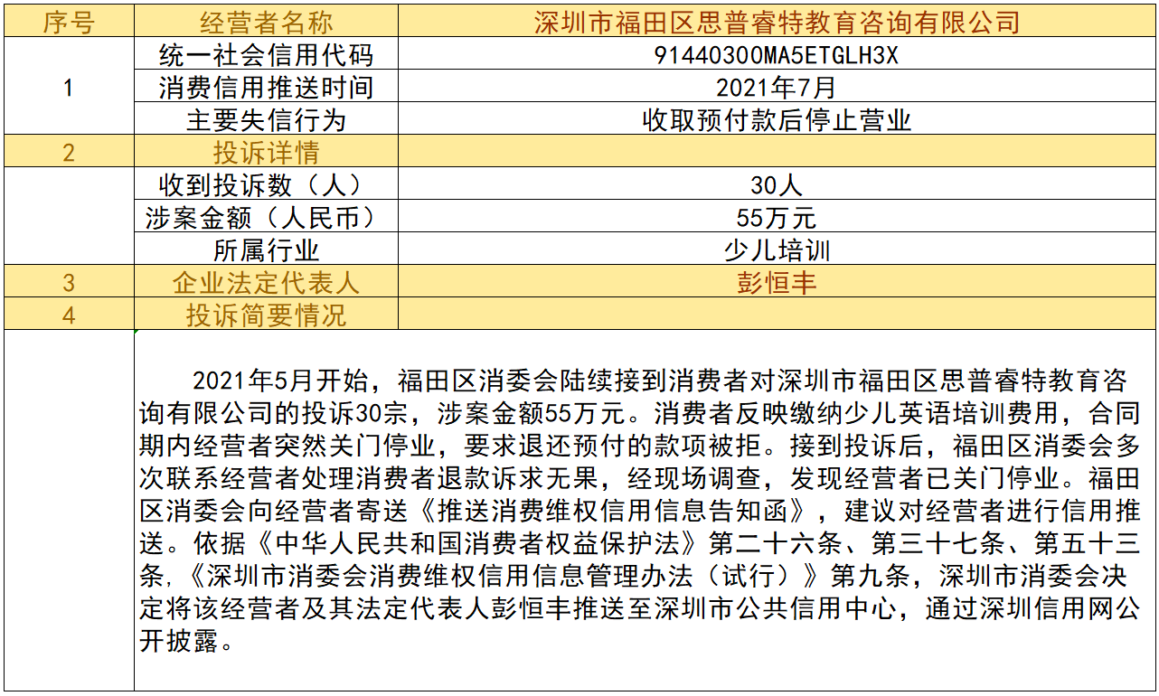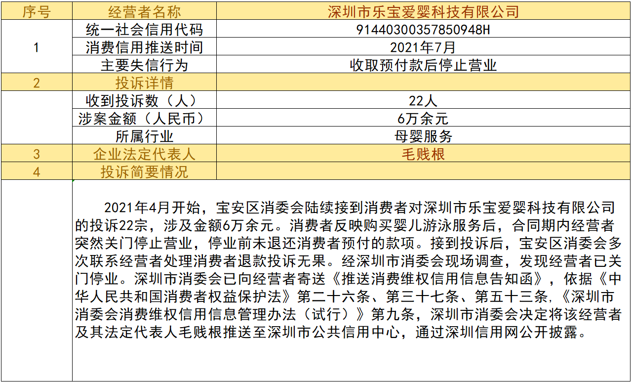 近日,深圳市消委會將九家“跑路”、未按約定退還消費(fèi)者預(yù)付款項(xiàng)的經(jīng)營者及其主要負(fù)責(zé)人推送至深圳市公共信用中心,失信經(jīng)營者信息信息將通過深圳信用網(wǎng)公開披露。