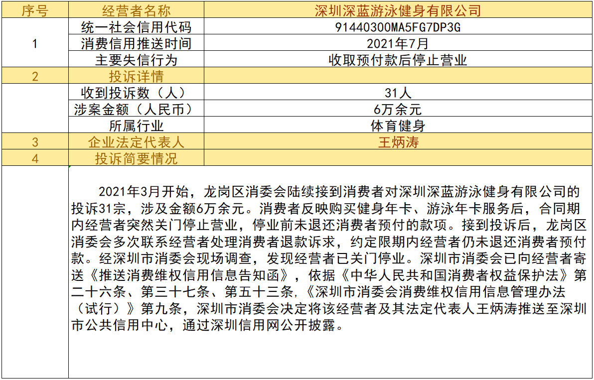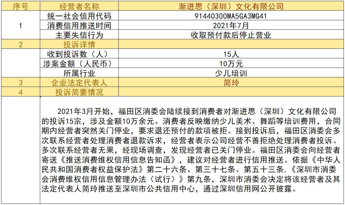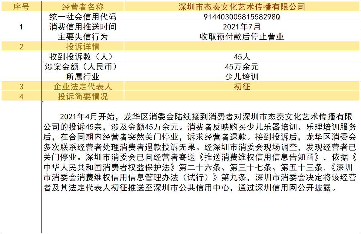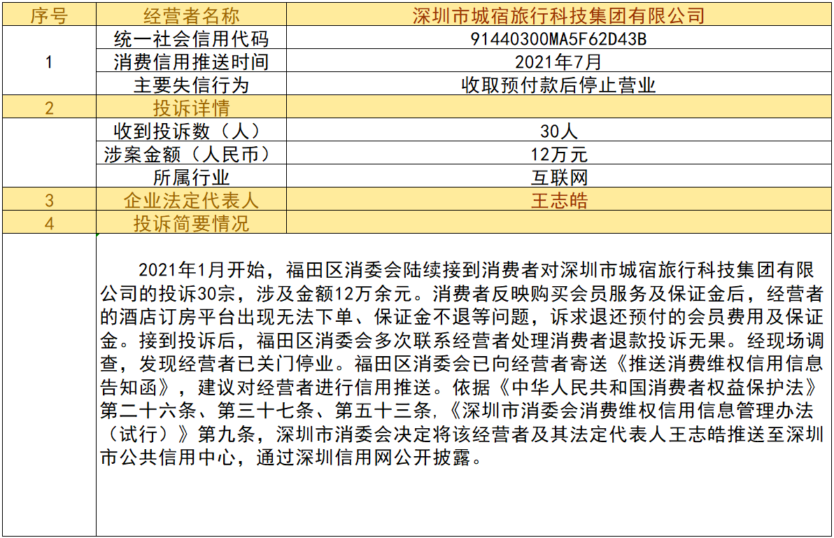 近日,深圳市消委會將九家“跑路”、未按約定退還消費(fèi)者預(yù)付款項(xiàng)的經(jīng)營者及其主要負(fù)責(zé)人推送至深圳市公共信用中心,失信經(jīng)營者信息信息將通過深圳信用網(wǎng)公開披露。