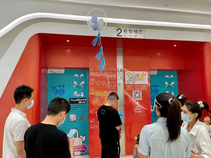 以壹方城為大型展廳,打造巨型貓瑜伽互動點(B1中心廣場)及巨型漫畫打卡墻 (小米通道前 ),全場還閃現(xiàn)各種創(chuàng)意貓貓漫畫貼紙,包括玻璃圍欄、店鋪櫥窗、電梯門,甚至是小小垃圾桶也有細節(jié)設(shè)計,沉浸式的“吸貓”逛展體驗,讓人獲得滿滿療愈之感。不得不說,貓出沒 ·tango藝術(shù)特展實屬匠心之作,氛圍感和體驗感極佳。