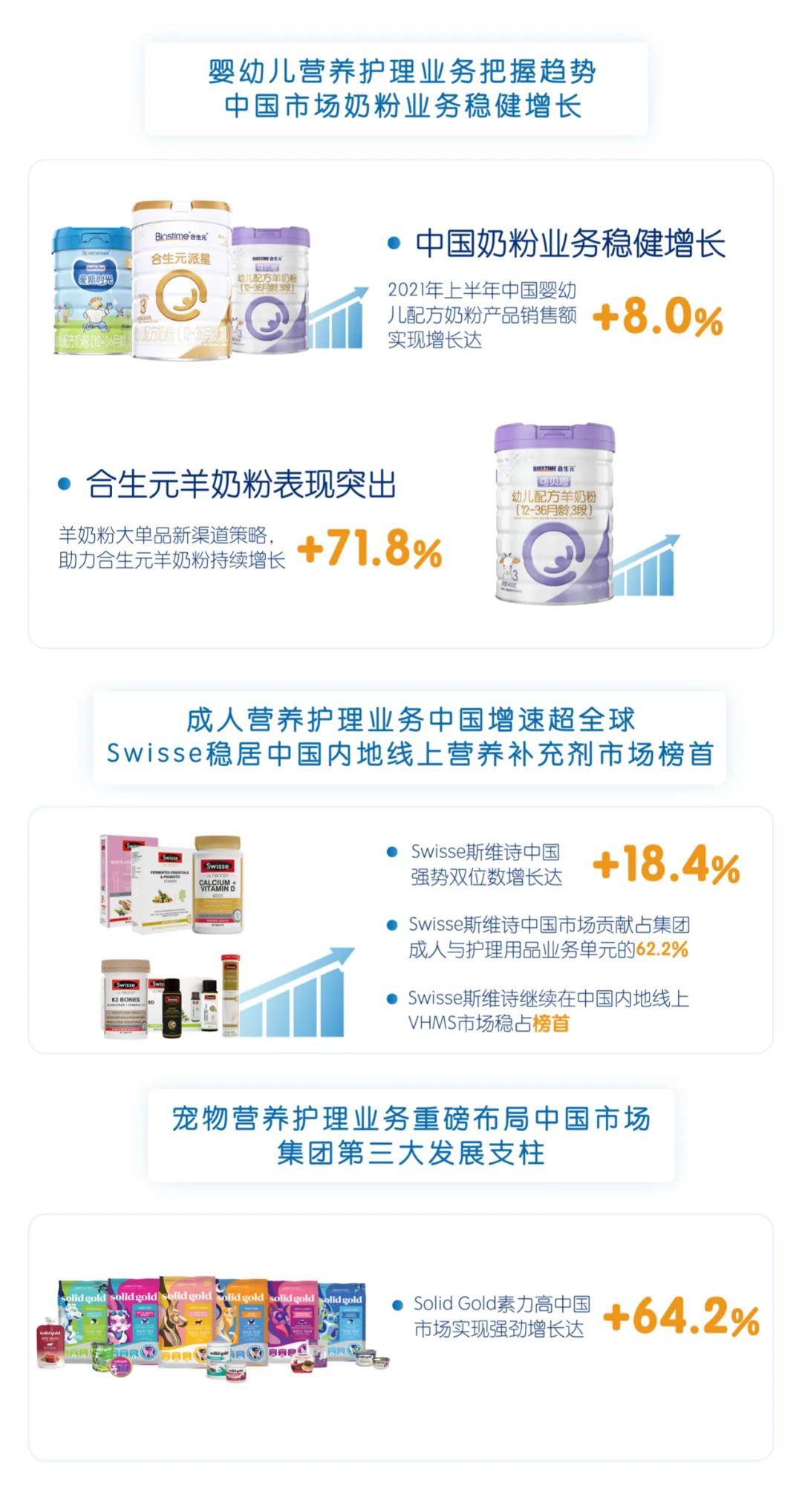 截至2021年6月30日,健合集團(tuán)2021上半年?duì)I收達(dá)54.2億元,同比增長5.0%,經(jīng)調(diào)整可比凈利潤6.6億元,增加7.0%。其中,嬰幼兒營養(yǎng)及護(hù)理用品業(yè)務(wù)單元(BNC)中國市場奶粉業(yè)務(wù)銷售額實(shí)現(xiàn)8.0%的增長。成人營養(yǎng)及護(hù)理用品業(yè)務(wù)單元(ANC)在上半年重拾升勢,Swisse斯維詩中國帶來強(qiáng)勢雙位數(shù)增長達(dá)18.4%。中國市場于2021年4月正式整合后啟動的寵物營養(yǎng)及護(hù)理用品業(yè)務(wù)單元(PNC)上半年實(shí)現(xiàn)強(qiáng)勁增長達(dá)64.2%。2021年上半年,中國市場仍是集團(tuán)營收的最大貢獻(xiàn)者,占集團(tuán)總收入的81.7%。此外,除中國大陸和澳新地區(qū),其他區(qū)域業(yè)績同比增長10.7%(按報(bào)告基準(zhǔn)增長58.6%)。