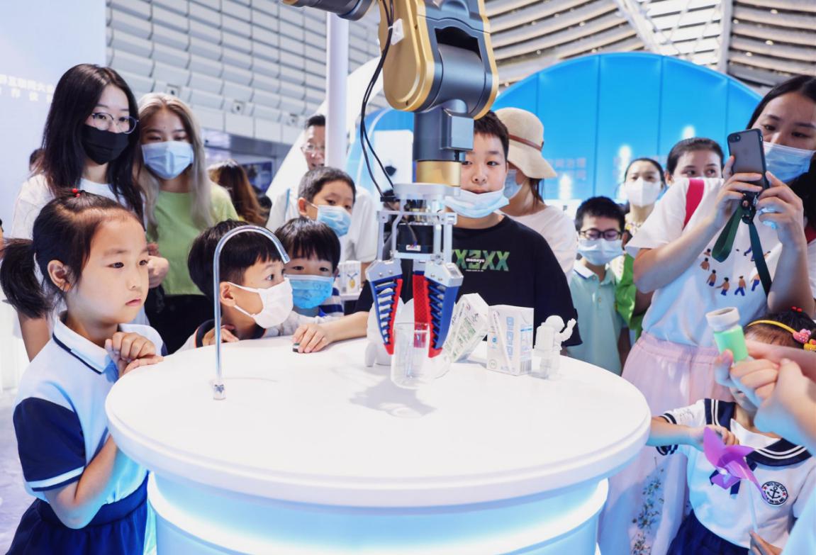 這牛奶和其他的不太一樣,很香濃?!半x心精萃‘白科技’開啟臻濃新紀(jì)元”展臺一直就是博覽會現(xiàn)場的“人氣王”,這里以宇宙探索為主題,科幻感十足,火箭發(fā)動機(jī)噴出淡淡煙霧,三臺智能機(jī)械臂不停忙碌,人們排起長隊(duì),品嘗由“離心精萃科技”現(xiàn)場調(diào)制的伊利臻濃牛奶。在這里,吸引觀眾的不僅是美味的伊利牛奶,也有滿滿的數(shù)字科技。