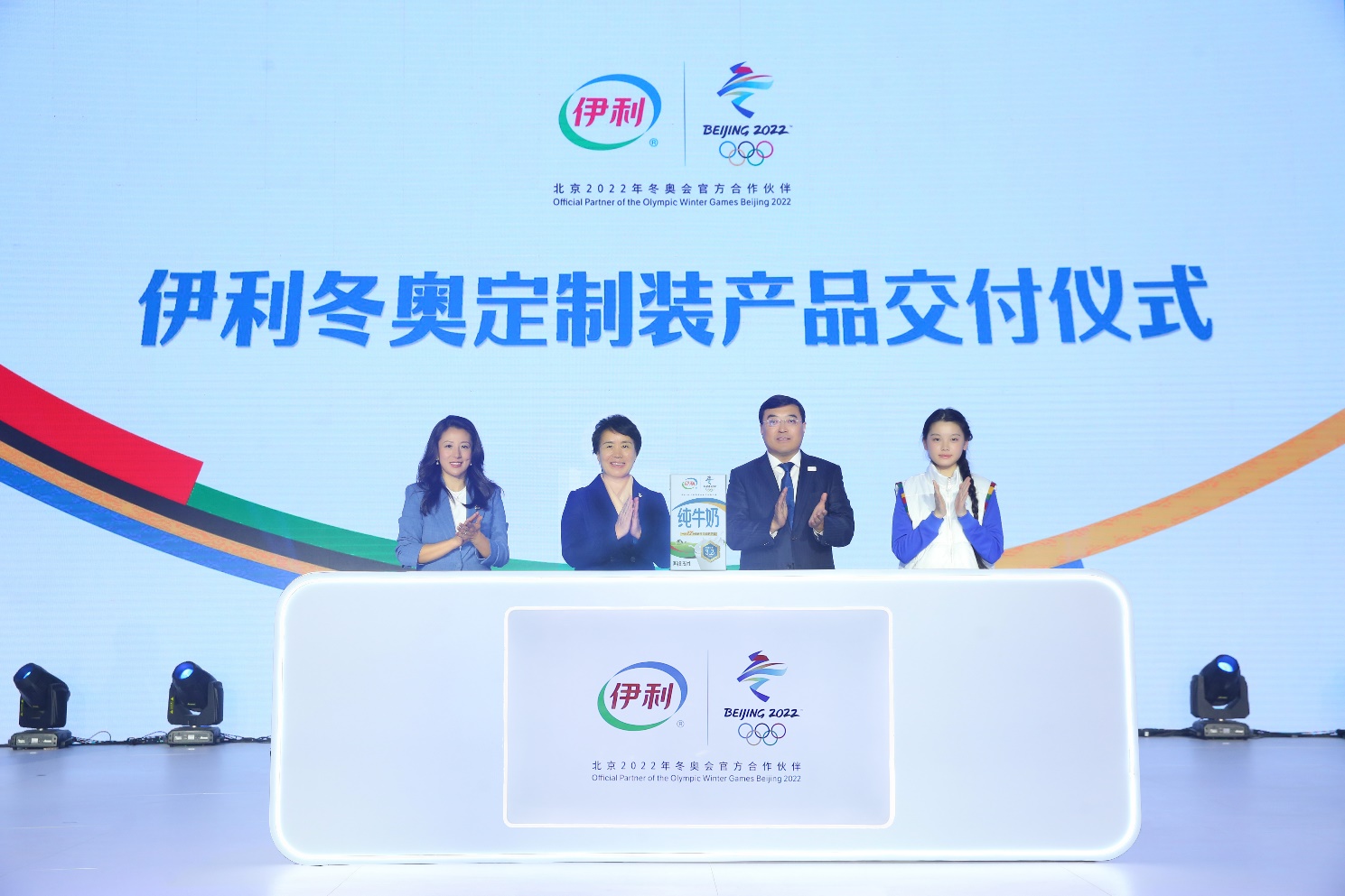 北京冬奧組委專職副主席、秘書長韓子榮(左二),伊利集團董事長、總裁潘剛(右二),北京冬奧組委運動員委員會主席楊揚(左一),伊利冬奧志愿團形象大使(右一)共同啟動伊利冬奧定制裝產(chǎn)品交付儀式