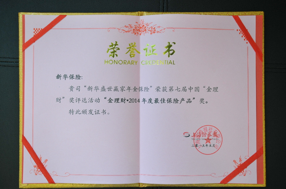 2015年5月28日,上海證券報主辦的第七屆“金理財”獎頒獎典禮在上海舉行。經(jīng)專家評審團的嚴格評審、結合網(wǎng)絡投票和微信投票情況,在進行綜合評議后,“新華盛世贏家年金保險”榮膺最佳保險產(chǎn)品獎。
