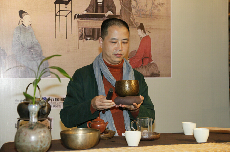 周三茶會(huì)的經(jīng)行禪茶創(chuàng)始人汪林生在進(jìn)行禪茶表演