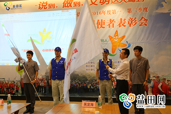 深圳新聞網(wǎng)訊(記者 鄧雪婷鄭創(chuàng)彬)8月18日下午,鹽田區(qū)“說到,做到,文明達(dá)人駕到”活動2016年第一、第二季度文明使者表彰會在鹽田紫禁書院舉行。姚軍、任秋芬、王茹洪、劉雪霞、黃東、劉曉紅、李廣慧、熊小云、鐘丹丹、羅少德10名文明使者榮獲表彰。區(qū)委常委、宣傳部部長吳定?,F(xiàn)場為文明使者頒獎(jiǎng),并為文明微行動深圳地鐵8號線小分隊(duì)授旗。