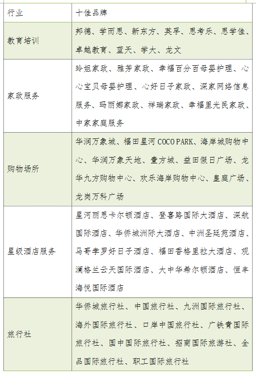 教育培訓(xùn)方面20個課外培訓(xùn)機(jī)構(gòu)品牌的凈推薦值得分均為正值,整體平均得分為13.7,邦德教育以19.9的高分榮登教育培訓(xùn)行業(yè)榜單首位;家政服務(wù)行業(yè)20家調(diào)查企業(yè)平均分值為12.8,玲姐家政以高于平均值7.4分,排名家政行業(yè)第一位;購物場所方面選取20家購物中心,20家購物中心得分同樣為正值,整體平均分為19.8,華潤萬象城以28.5的高分獲得購物中心排行榜桂冠,福田星河coco park以0.1分的劣勢排在榜單第二位;星級酒店服務(wù)方面,平均凈推薦值達(dá)到30.8分,高于同期發(fā)布其他四個行業(yè),排名第一的是星河麗思卡爾頓酒店,凈推薦值為37.0分;旅行社方面,排名第一的旅行社為華僑城旅行社評分29.8分,但20家旅行社之間評分差異較大,凈推薦值僅為12.0分,低于同期發(fā)布的其他行業(yè)。