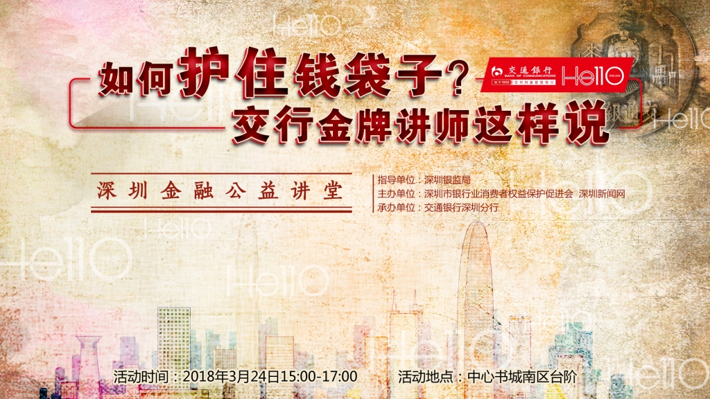在深圳銀監(jiān)局指導(dǎo)下,由深圳新聞網(wǎng)和深圳市銀行業(yè)消費(fèi)者權(quán)益保護(hù)促進(jìn)會(huì)共同主辦,交通銀行深圳分行承辦的2018年“深圳金融公益講座”系列活動(dòng)將在3月24日14:30,于中心書城南區(qū)大臺(tái)階拉開帷幕。