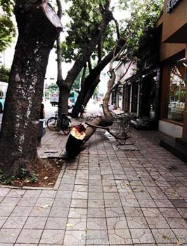 然而行道樹的不當(dāng)種植與生長(zhǎng)也會(huì)帶來(lái)許多危害。行道樹傾斜生長(zhǎng)極易造成樹木倒伏,倒伏后造成倒壓占道的同時(shí)也存在巨大的安全隱患。且行道樹龐大的樹根也會(huì)存在破壞人行道及盲道的現(xiàn)象,造成路面不平,部分傾倒的樹木還易引發(fā)斷電和漏電等問(wèn)題,給市民生活帶來(lái)不便。