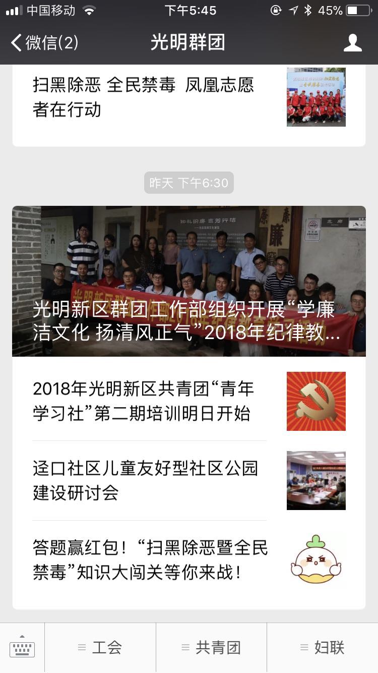 案例介紹:深圳市光明新區(qū)群團工作部公眾賬號,包括光明工會、光明團委、光明婦聯(lián),發(fā)布新聞資訊、提供便捷服務(wù)。