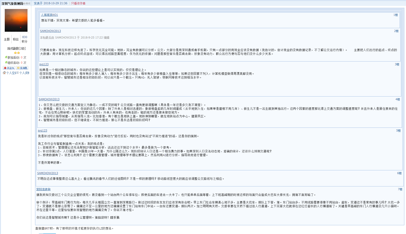 9月25日有市民在深圳論壇以《關(guān)于公交線路規(guī)劃和站臺(tái)設(shè)置的一點(diǎn)建議》為題發(fā)帖,自稱是曾經(jīng)的公交人和現(xiàn)在的私家車駕駛員,對(duì)深圳的公交出行一口氣提出3個(gè)意見。帖文中最為吸引人眼球的觀點(diǎn)就是“將全市各站點(diǎn)進(jìn)行編號(hào),采用計(jì)算機(jī)技術(shù),對(duì)編號(hào)站點(diǎn)進(jìn)行排列組合,每個(gè)方向連續(xù)的10個(gè)站點(diǎn)有三條線路覆蓋,超出三條屬于線路密度高或規(guī)劃不合理?!眴芜@一句話就在跟帖中引發(fā)了針鋒相對(duì)的辯論,有支持的市民認(rèn)為:主意不錯(cuò),實(shí)現(xiàn)起來應(yīng)該也難度不大。現(xiàn)在不是整天提什么物聯(lián)網(wǎng)、大數(shù)據(jù)、智慧城市么,這個(gè)不就是這些高新技術(shù)在公交出行方面的應(yīng)用。不看好的市民則認(rèn)為:目前技術(shù)、管理理論還無(wú)法做智能分析,遠(yuǎn)遠(yuǎn)還達(dá)不到這個(gè)水平,“最多是做為一個(gè)參考”。