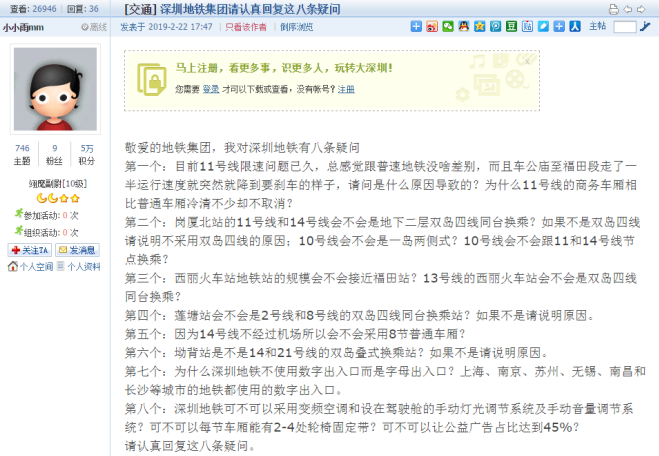 2月22日,有市民在深圳論壇發(fā)帖《敬愛的地鐵集團,我對深圳地鐵有八條疑問》,對深圳地鐵提出一系列專業(yè)且詳細的問題:“11號線限速問題由來已久”“11號線商務車廂比普通車廂冷清不少卻不取消”,對新建地鐵線路的換乘方式、14號線采用普通車廂還是商務車廂、西麗站的規(guī)模等建設方案提出疑問,并質(zhì)疑地鐵站出入口使用字母標識而不是數(shù)字標識是否合理。帖文中也提出了“采用變頻空調(diào)”“手動燈光調(diào)節(jié)系統(tǒng)及手動音量調(diào)節(jié)系統(tǒng)”“每節(jié)車廂能有2-4處輪椅固定帶”等建議,并希望“車站內(nèi)公益廣告占比要達到45%”。