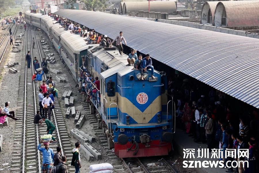 從達(dá)卡到邁門(mén)辛的火車(chē)是國(guó)內(nèi)最擁擠的線(xiàn)路之一,通常有數(shù)千名旅客擠在載客人數(shù)只有650人的火車(chē)?yán)?,有的抓著把手,有的蹲在門(mén)口,要不就蹲在車(chē)箱間的聯(lián)軸上或坐在車(chē)頂上。李仁奇攝