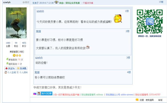 記者從問政平臺得知,5月底以來,還有市民發(fā)帖反映,除華潤萬家外,科技園萬象天地華潤Ole、僑香路沃爾瑪?shù)瘸幸泊嬖诓惶峁┘堎|(zhì)購物小票的情況。目前,市民仍然普遍認同超市應(yīng)主動提供紙質(zhì)購物小票,避免顧客被價格欺詐。有市民表示:“遇到最多的是優(yōu)惠打折,實際還是原價買單,這時,手中有小票一目了然,不花冤枉錢?!边€有市民質(zhì)疑,“奸商,動不動就打著環(huán)保這些高大上的理由作借口”。同時,也有市民體驗過微信小票后表示,“沃爾瑪手機掃碼付款是沒有紙票,購物小票藏在微信公眾號里,退換貨就在那里面進行。這就是科技發(fā)達帶來的豐碩成果,挺好的?!苯刂劣浾甙l(fā)稿時,市民關(guān)于科技園萬象天地華潤Ole、僑香路沃爾瑪?shù)瘸胁惶峁┵徫镄∑钡奶倪€沒有得到相關(guān)部門回應(yīng)。