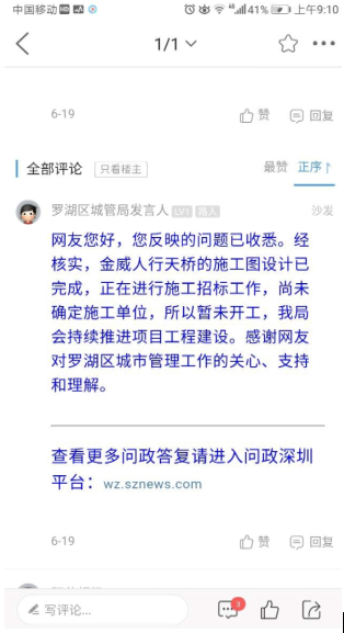 6月19日,羅湖區(qū)城管局表示“施工圖設(shè)計已完成,正在進行施工招標工作”。7月24日,該市民回帖詢問招標是否已有結(jié)果,表示“依然沒見工程隊施工”。