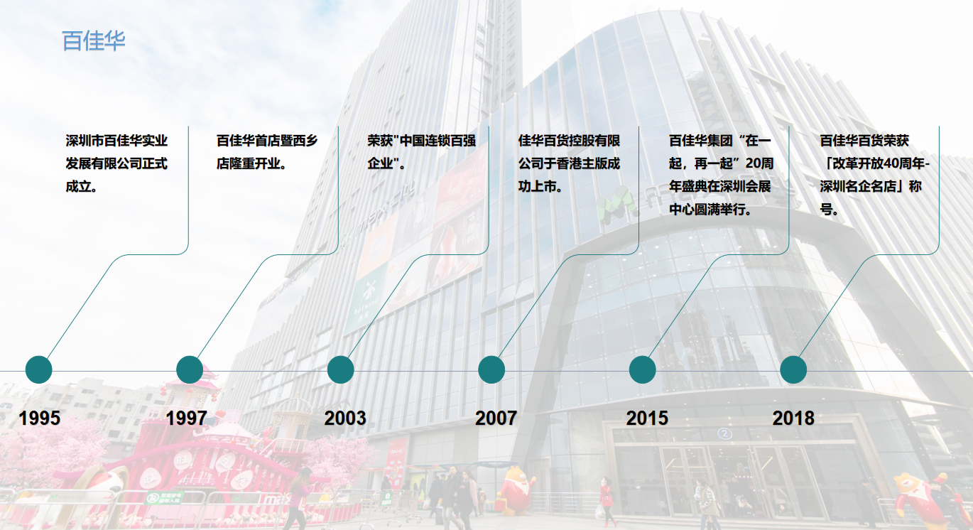 深圳市百佳華百貨有限公司是一家以中國商務部批準成立的外商投資企業(yè),注冊資金22040萬元。目前,公司在深圳、佛山、南寧等地開設(shè)有十多家連鎖購物商場,經(jīng)營面積約30萬平方米,年銷售額超20億元。于2007年5月21日在香港聯(lián)交所主板成功上市,成為廣東省為數(shù)不多的實現(xiàn)整體上市的零售企業(yè)。
