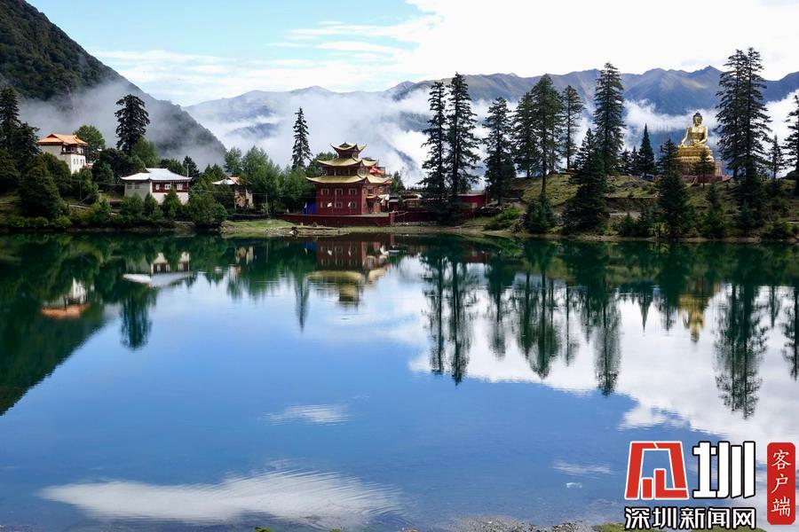 湖的四周是森林和由措卡寺寺僧主持修建的藏傳佛教各色建筑,它們時而云遮霧障,時而與藍天白云一起倒映在湖中。李仁奇攝