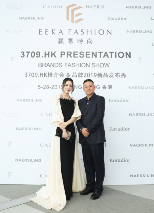 現(xiàn)任贏家時尚控股有限公司董事局主席金明先生和米蘭達可兒在2017年米蘭時裝周Koradior發(fā)布秀背景板合影