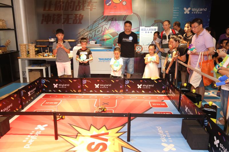 “我跟你說噢,那邊吹出來的泡泡能把我們倆都包進去!”“老媽,原來空氣的形狀是圓環(huán)形的呀……”歡聲笑語中,十幾項科技趣味項目讓小朋友們眼花繚亂、目不暇接,這其中,機器人對抗賽無疑是人氣最高的。賽場上,小朋友們分為紅藍兩隊,手持遙控器在兩側站好。“小朋友們注意啦,每一位機器人身上有一個藍色燈柱,碰撞擋板被撞到后,燈柱長度會縮短……”老師一邊在“戰(zhàn)場”中擺放機器人,一邊為孩子們詳細講解規(guī)則。一聲哨響,紅藍兩隊的“機器人大戰(zhàn)”拉開了帷幕,孩子們操控著自己的戰(zhàn)車,左右閃躲,時而用一個漂亮的側移甩掉追擊者,時而全力沖擊消耗對方的“藍條”。賽場邊的家長們似乎比小選手更為緊張,他們時不時俯下身子,為孩子們出謀劃策:“小超你看,邊上那個三號車藍條快沒了,快趕過去補一下!”一位父親看到了打破僵局的好機會,急忙提醒道,小朋友則心領神會,熟練的操縱著機器人貼了上去……經過一番努力,在成功拿下這寶貴的一分后,小朋友回頭與自己的老爸相視一笑,父子二人之間的默契,在這一刻體現(xiàn)的淋漓盡致。