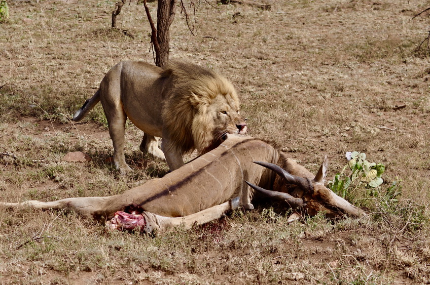 這頭估計(jì)重達(dá)二、三百斤的大羚羊是早晨被三頭雌獅捕獲的,雄獅趕到后,雌獅們各自撕扯一塊肉到遠(yuǎn)處享用去了。雄獅腹中饑餓,不顧乘坐兩臺(tái)越野車的十位游客近在咫尺,只管用力撕咬拖拽羚羊尸體。李仁奇 攝