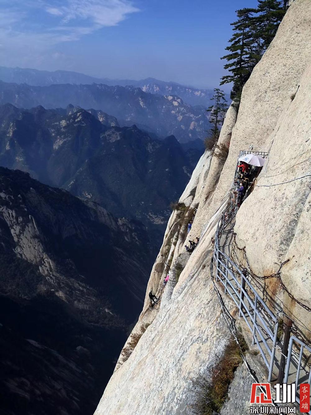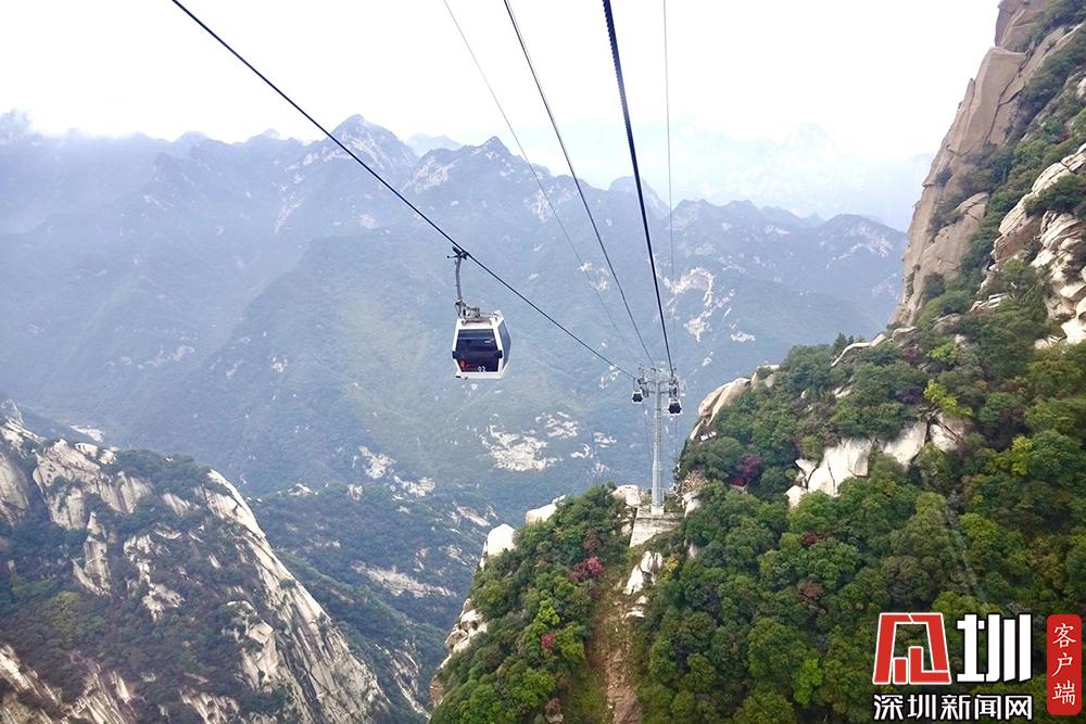 華山西峰的太華索道是迄今為止世界上第一條采取崖壁開鑿硐室站房、兩上兩下的起伏式走向、設中間站的單線循環(huán)脫掛式索道,總計投資5億余元建設。李酮攝。
