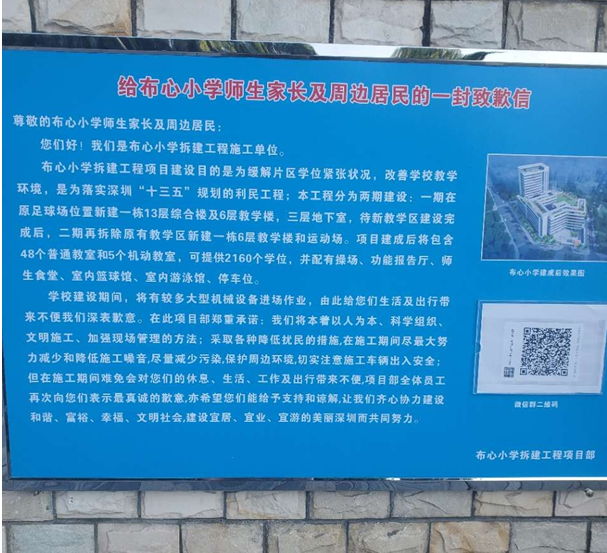 11月9日,有市民在深圳論壇發(fā)帖反映稱,“小孩如今就讀布心小學??砷_學一個月后,就看到校內有公示說學校將會原地重建。”該家長對學生的安全情況表示擔憂:“這幾年因地下結構受影響而導致路面坍塌的情況時有發(fā)生,現(xiàn)如今要在與教室目測距離不超過五米的地方建兩座分別為13層和6層的建筑,這樣大的工程量如果不分流,施工風險可想而知。即使重建采用高新技術,能夠保證教室的安全,但學生又如何能在學校與工地的混合期里度過至少四年以上的工期?粉塵和噪音對學生的影響也很大也可想而知。”