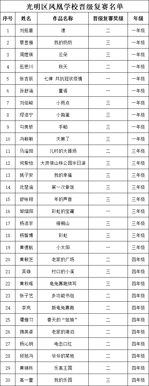 自2021年1月,活動征稿啟動以來,獲得了深圳市廣大中小學(xué)生、教師、文學(xué)愛好者的熱烈響應(yīng)積極參與,吸引了深圳百余所學(xué)校的上萬人關(guān)注報(bào)名?,F(xiàn)公布深圳市光明區(qū)鳳凰學(xué)校專場晉級復(fù)賽名單如下: