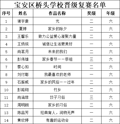 自2021年1月,活動(dòng)征稿啟動(dòng)以來,獲得了深圳市廣大中小學(xué)生、教師、文學(xué)愛好者的熱烈響應(yīng)積極參與,吸引了深圳百余所學(xué)校的上萬人關(guān)注報(bào)名。現(xiàn)公布寶安區(qū)橋頭學(xué)校晉級(jí)復(fù)賽名單如下:
