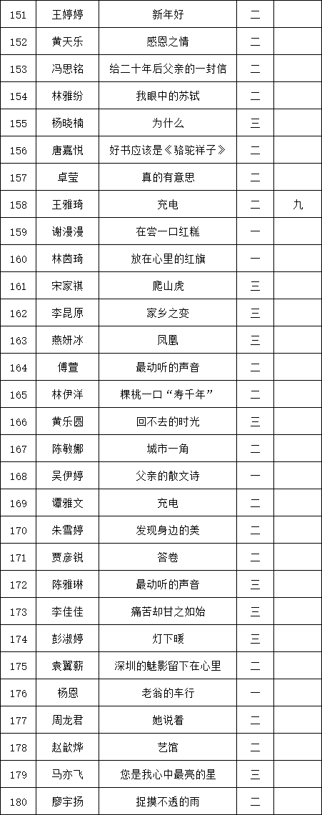 自2021年1月,活動(dòng)征稿啟動(dòng)以來(lái),獲得了深圳市廣大中小學(xué)生、教師、文學(xué)愛(ài)好者的熱烈響應(yīng)積極參與,吸引了深圳百余所學(xué)校的上萬(wàn)人關(guān)注報(bào)名?,F(xiàn)公布福田區(qū)梅山中學(xué)晉級(jí)復(fù)賽名單如下: