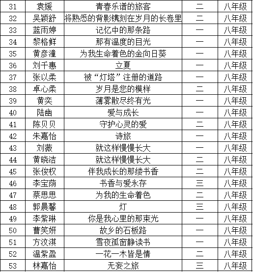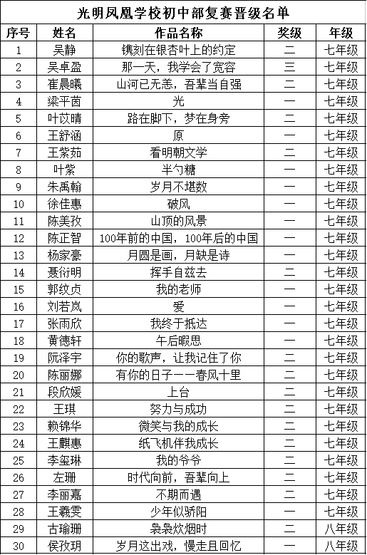 自2021年1月,活動征稿啟動以來,獲得了深圳市廣大中小學生、教師、文學愛好者的熱烈響應積極參與,吸引了深圳百余所學校的上萬人關注報名?,F(xiàn)公布光明區(qū)鳳凰學校晉級復賽名單如下: