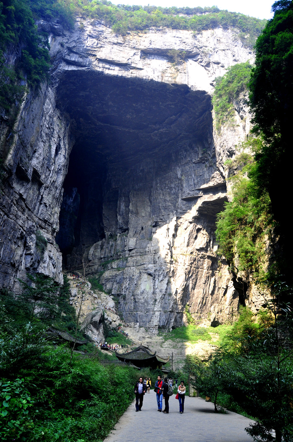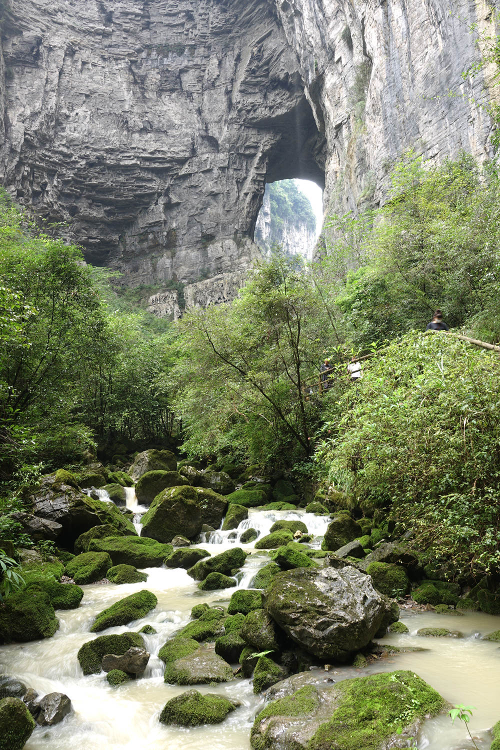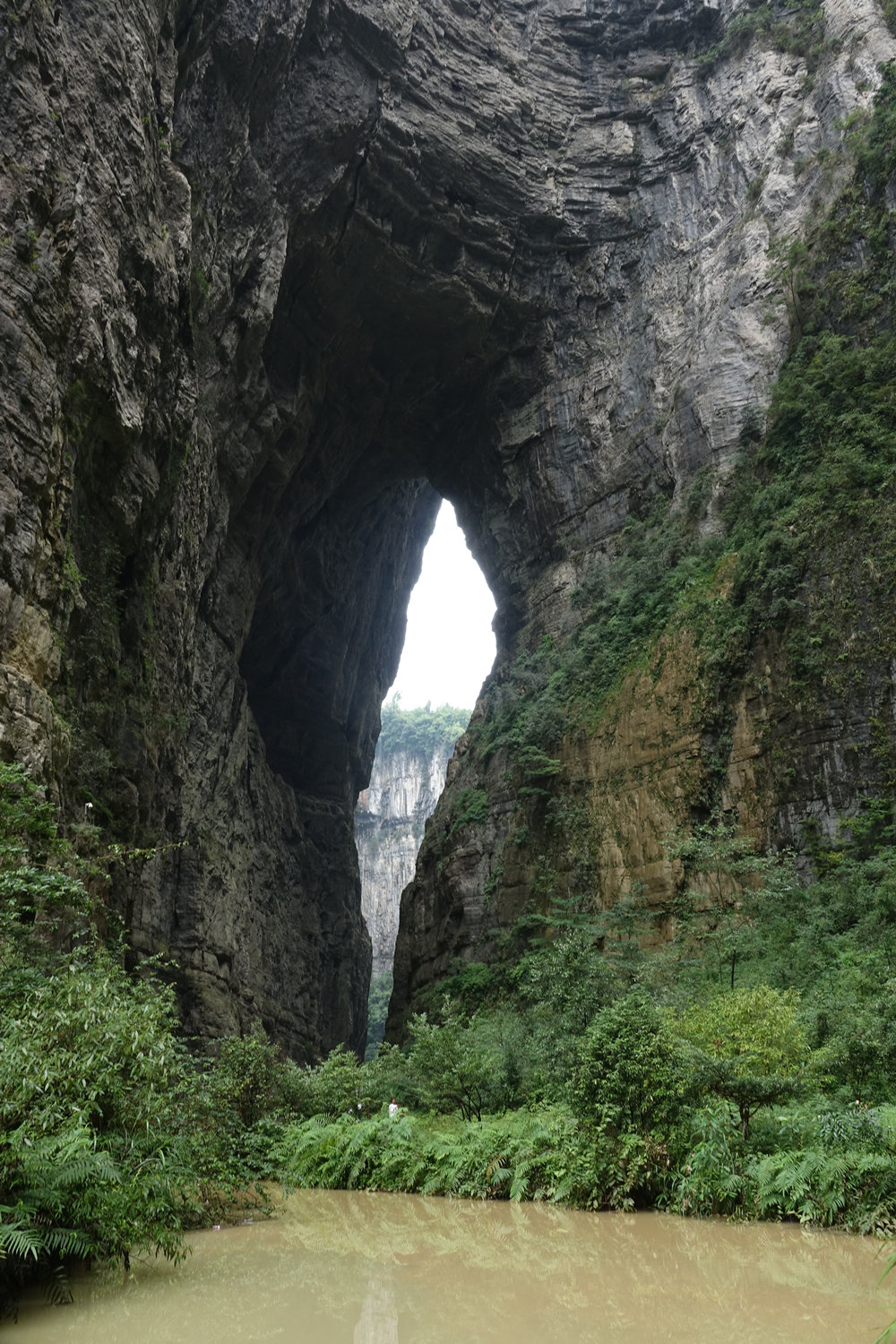 黑龍橋為羊水河峽谷上位置最下游的天生橋,因其拱洞幽深暗黑,似有一條黑龍蜿蜒于洞頂而得名。橋厚107m,拱孔跨度16-49m,橋面寬達193m,為三橋中寬度最大者。李仁奇 攝