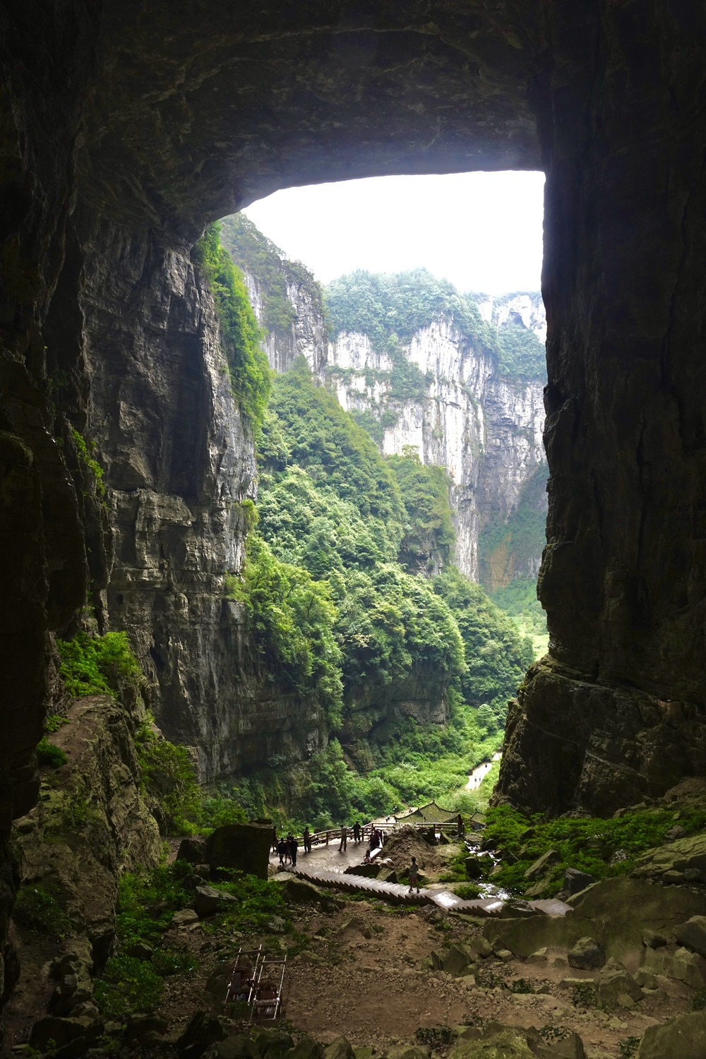 天龍橋?yàn)檠蛩訊{谷上的第一座天生橋,又名頭道橋,高大厚重、磅礴氣勢(shì),以雄壯稱奇。橋高235m,橋厚150m,平均拱橋高度96m。拱孔跨度20-75m,平均34m,橋面寬度147m。李仁奇 攝