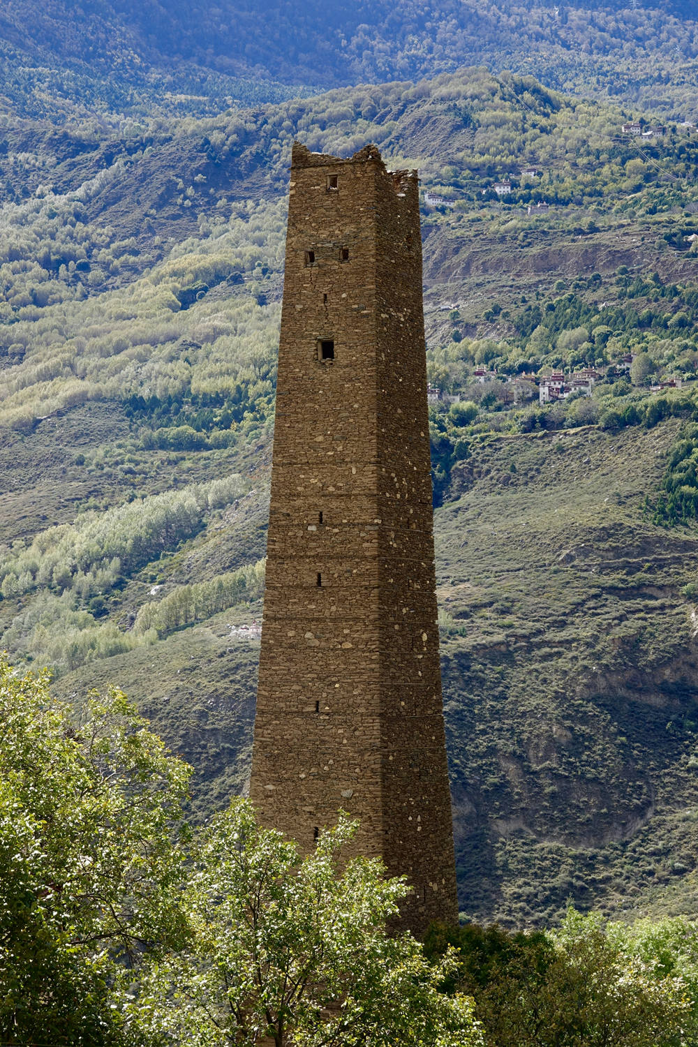 古碉為片石或石塊夾泥砌成,棱角筆直,墻面光滑,下寬上窄,一般高20余米,最高達(dá)50米,內(nèi)建樓層十余層至二十余層,每層可容納10余人。李仁奇 攝